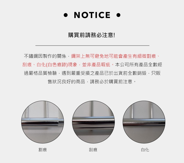 購買前務必注意:不鏽鋼因製作關係,可能會產生細微割痕、刮痕、白色痕跡等現象,均非產品瑕疵。