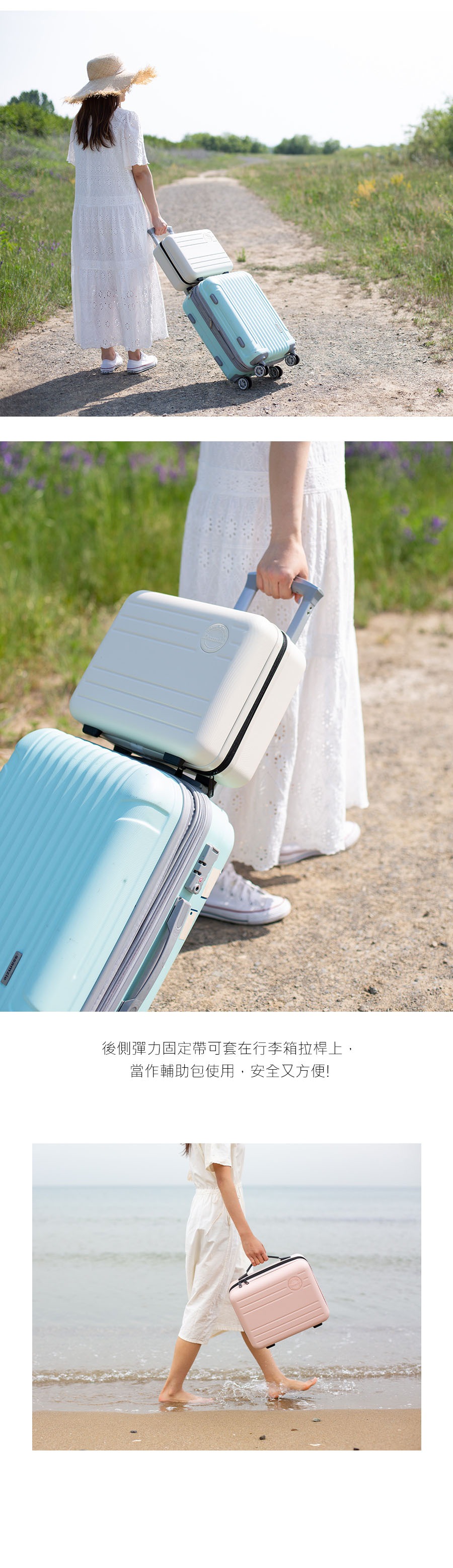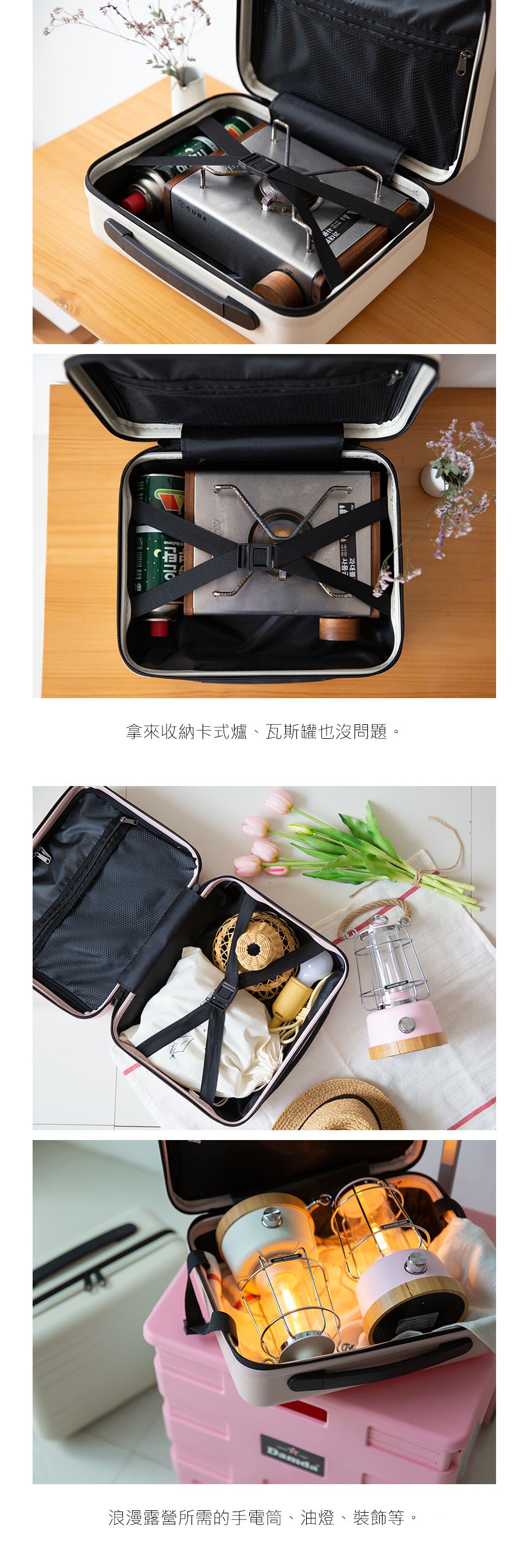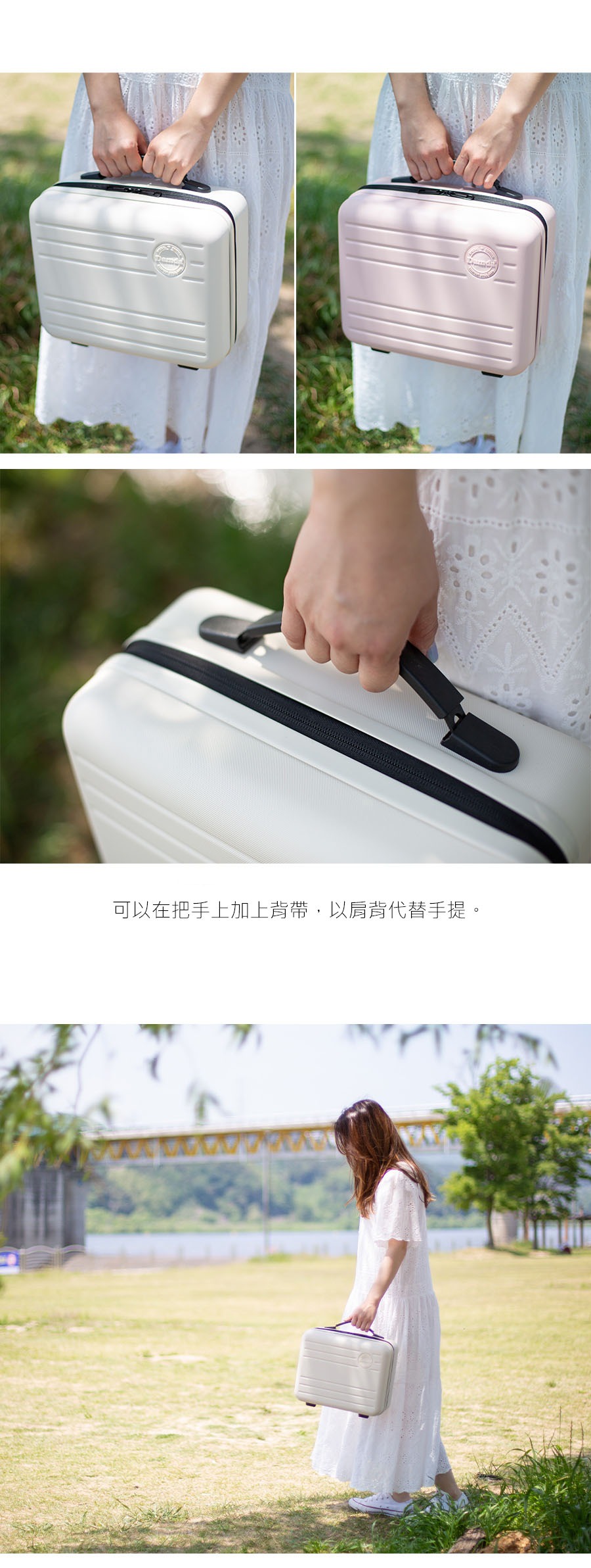 有把手方便攜帶,後側還有彈力固定帶設計,可固定於行李箱或推車拉桿上。