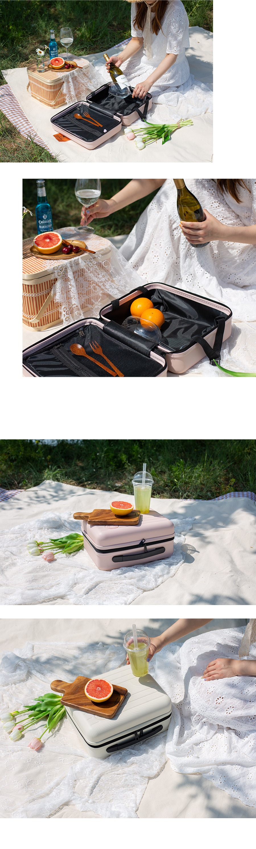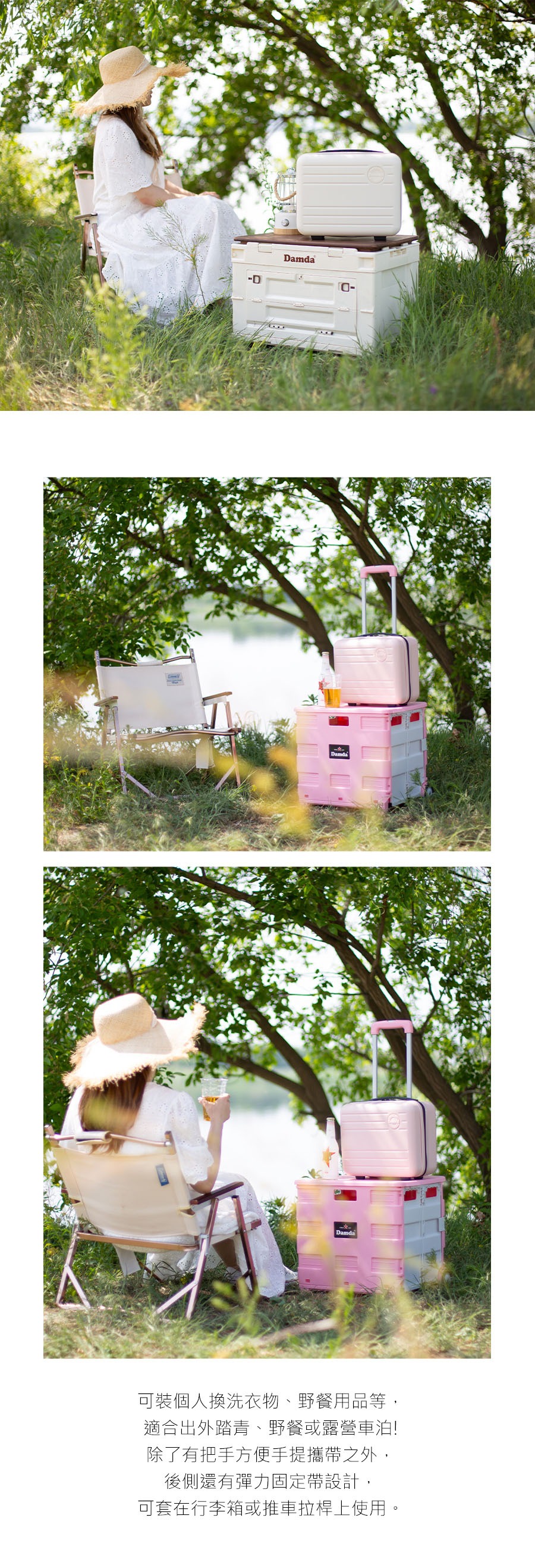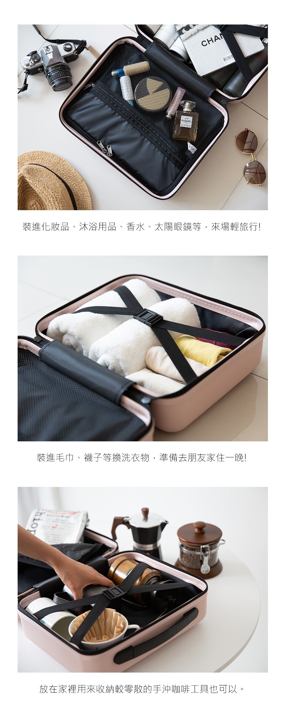 有把手方便攜帶,後側還有彈力固定帶設計,可固定於行李箱或推車拉桿上。