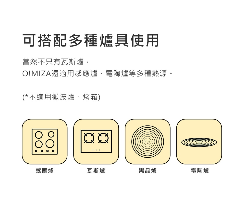 可搭配感應爐、瓦斯爐、黑晶爐、電陶爐。