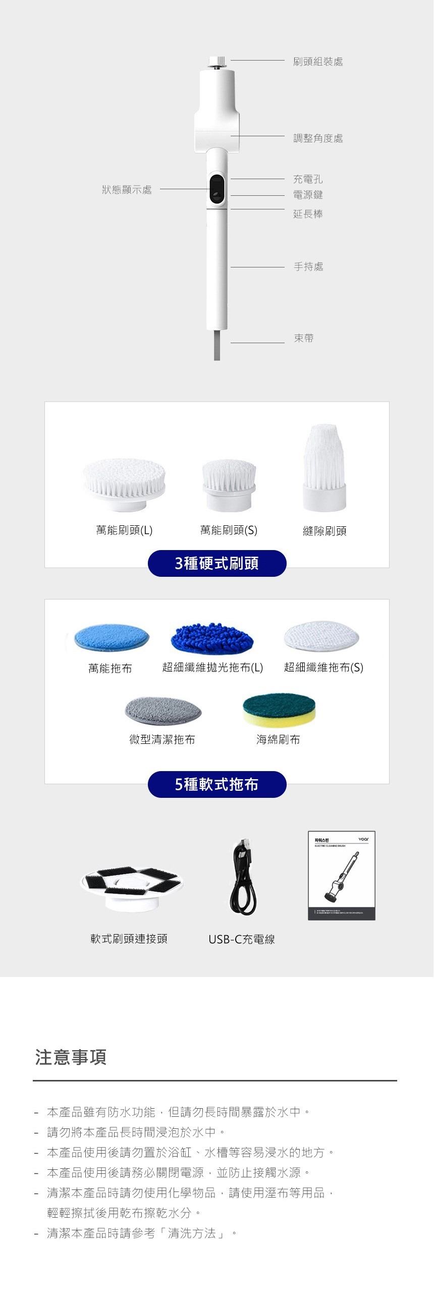 內含:清潔機、3種硬式刷頭、5種軟式拖布、USB-C充電線