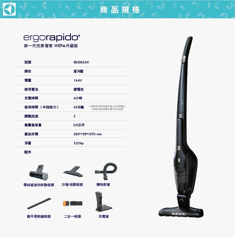 【Electrolux 伊萊克斯】完美管家二合一無線HEPA吸塵器(ZB3302AK 星河藍)