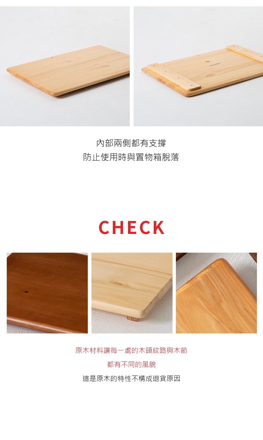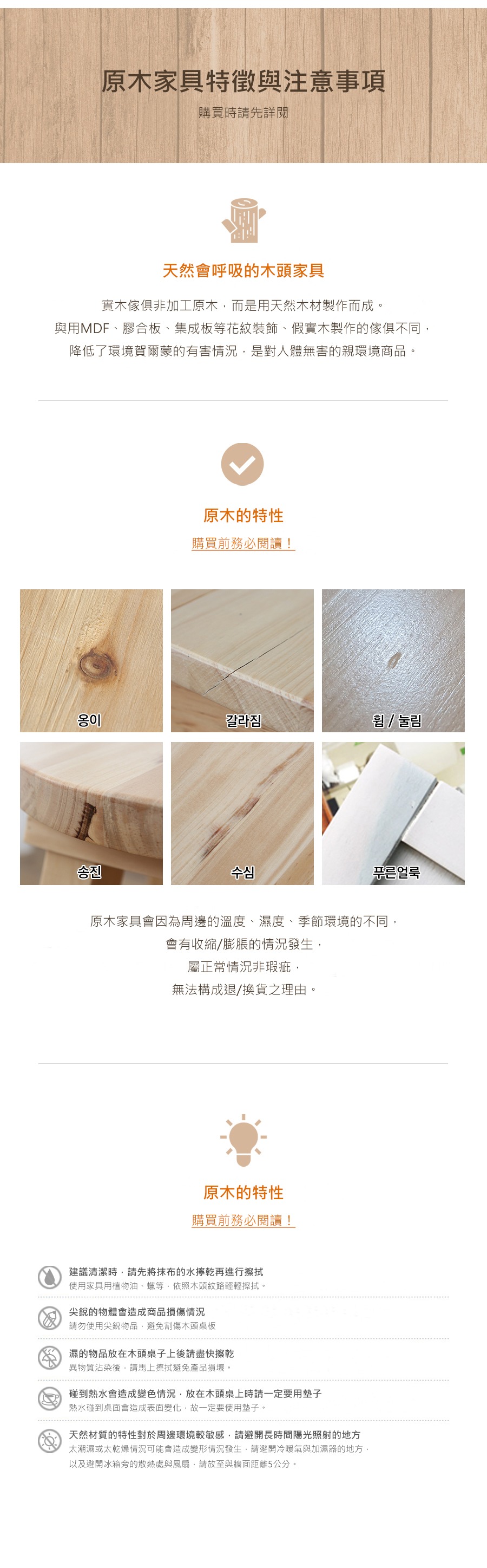 原木材料讓每一處的木頭紋路與木節都有不同風貌,恕不受理因原木紋路色澤的退換貨原因。